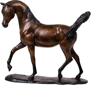 Experience the majestic elegance of the Arabian breed with our Antique Chestnut Arabian Stallion. This 13.4-inch tall masterpiece captures the iconic "floating trot," featuring a high-carried tail, alert ears, and a gracefully arched neck. The stunning classic reddish-brown patina radiates a warm, aged lustre, making it a sophisticated focal point that symbolizes success, nobility, and timeless grace.