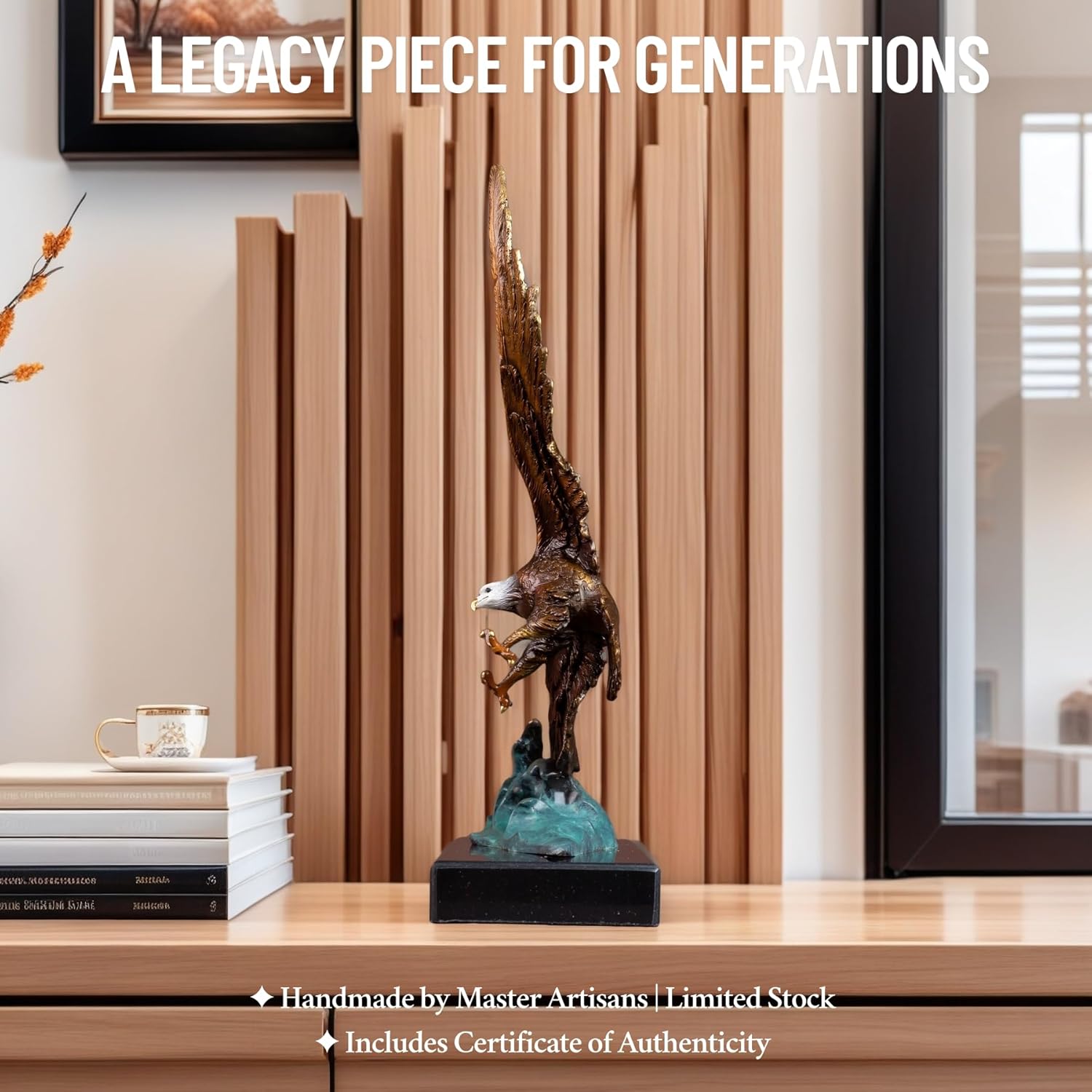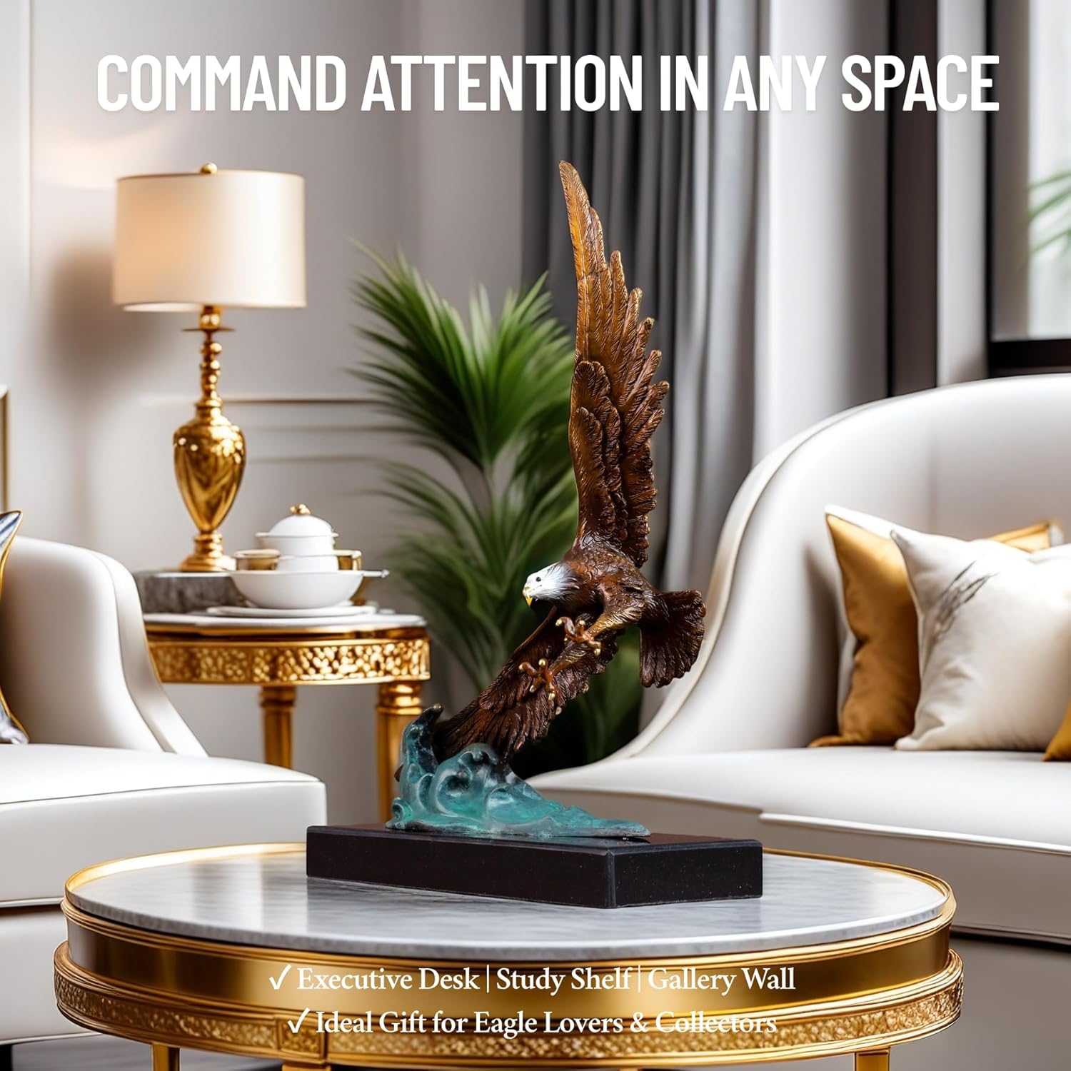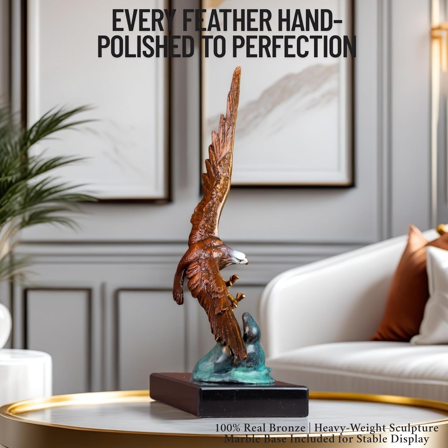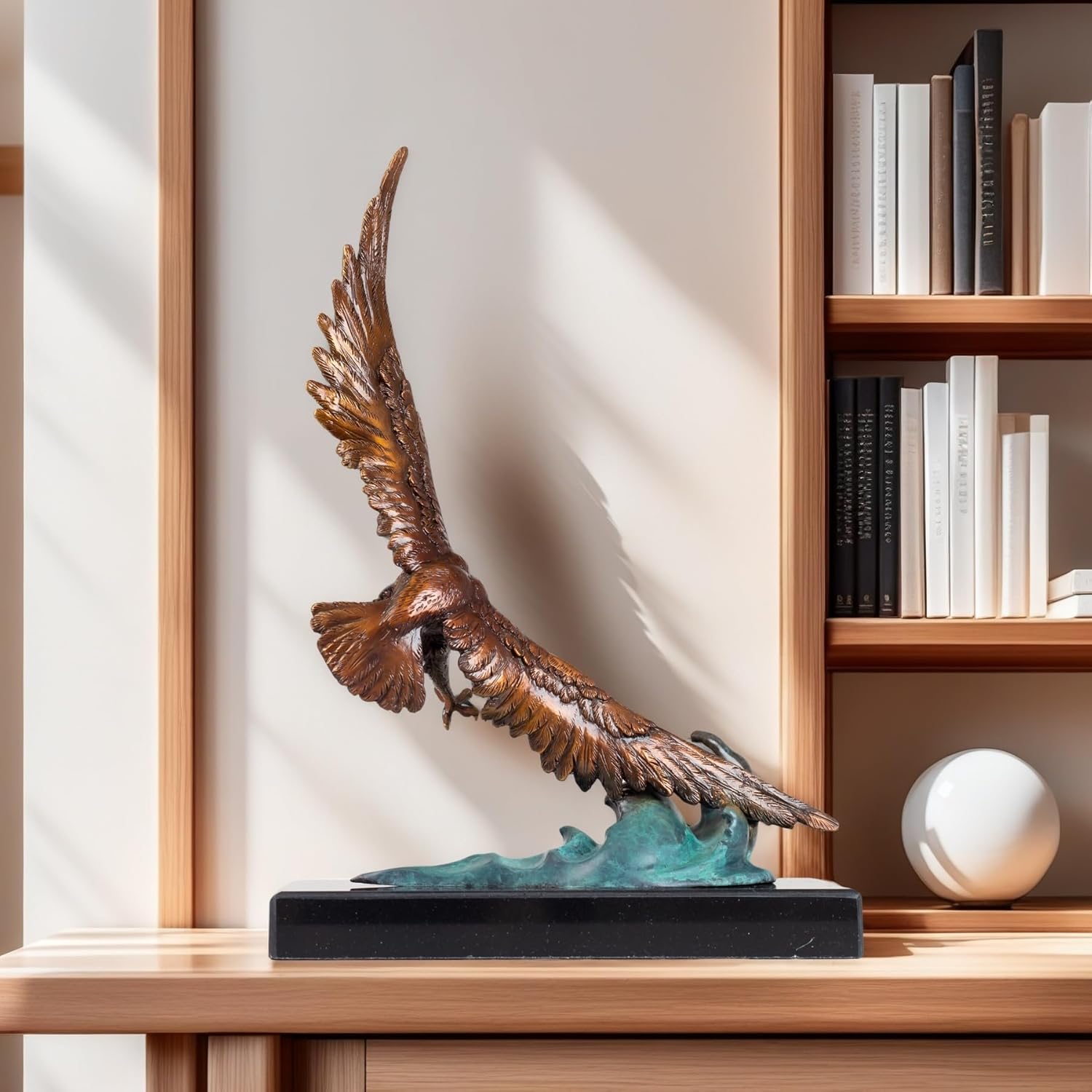 Bronze Eagle Sculpture on Marble Base ā 15.2'' Handcrafted Bald Eagle Diving Over Waves ā Lost-Wax Cast Bronze Art Statue for Office, Home Decor, Collection & Gift