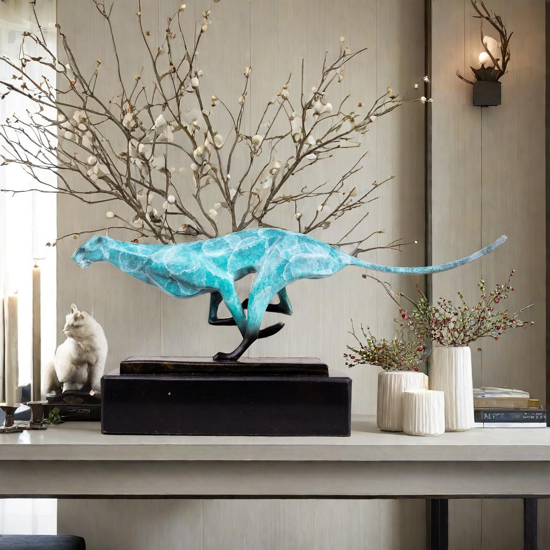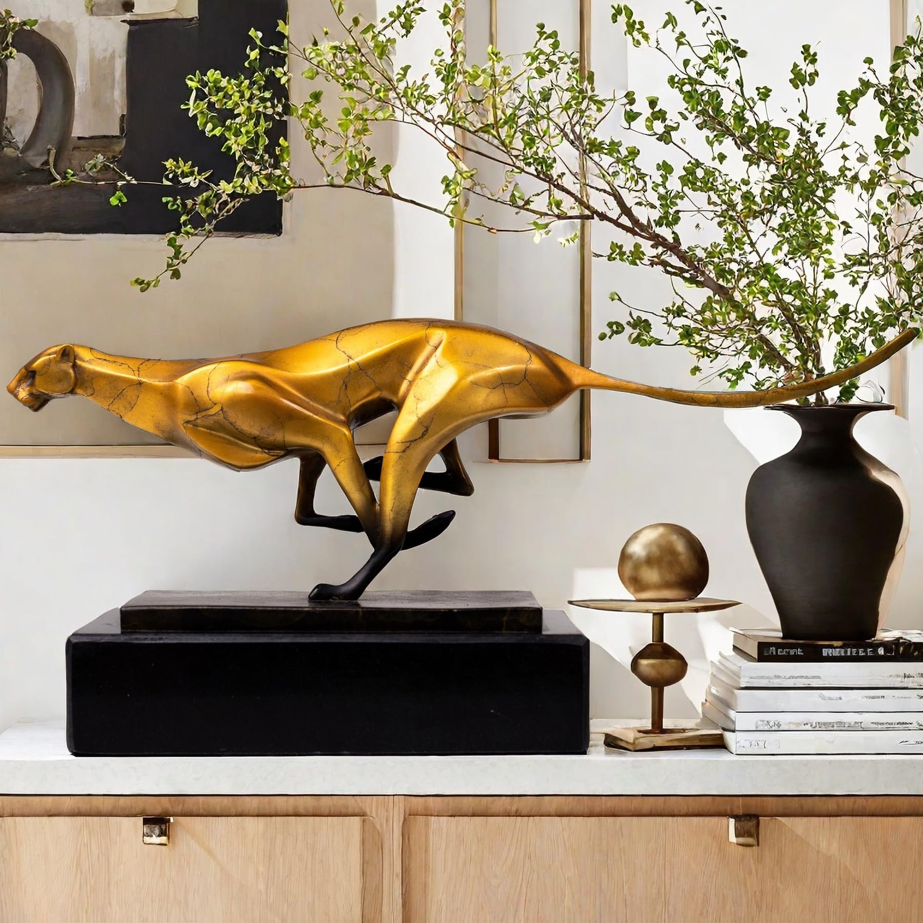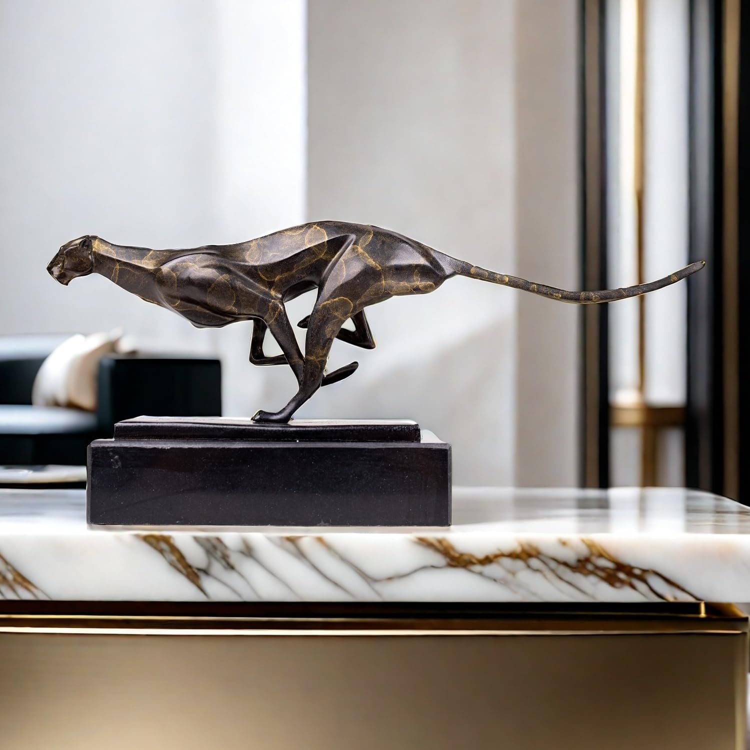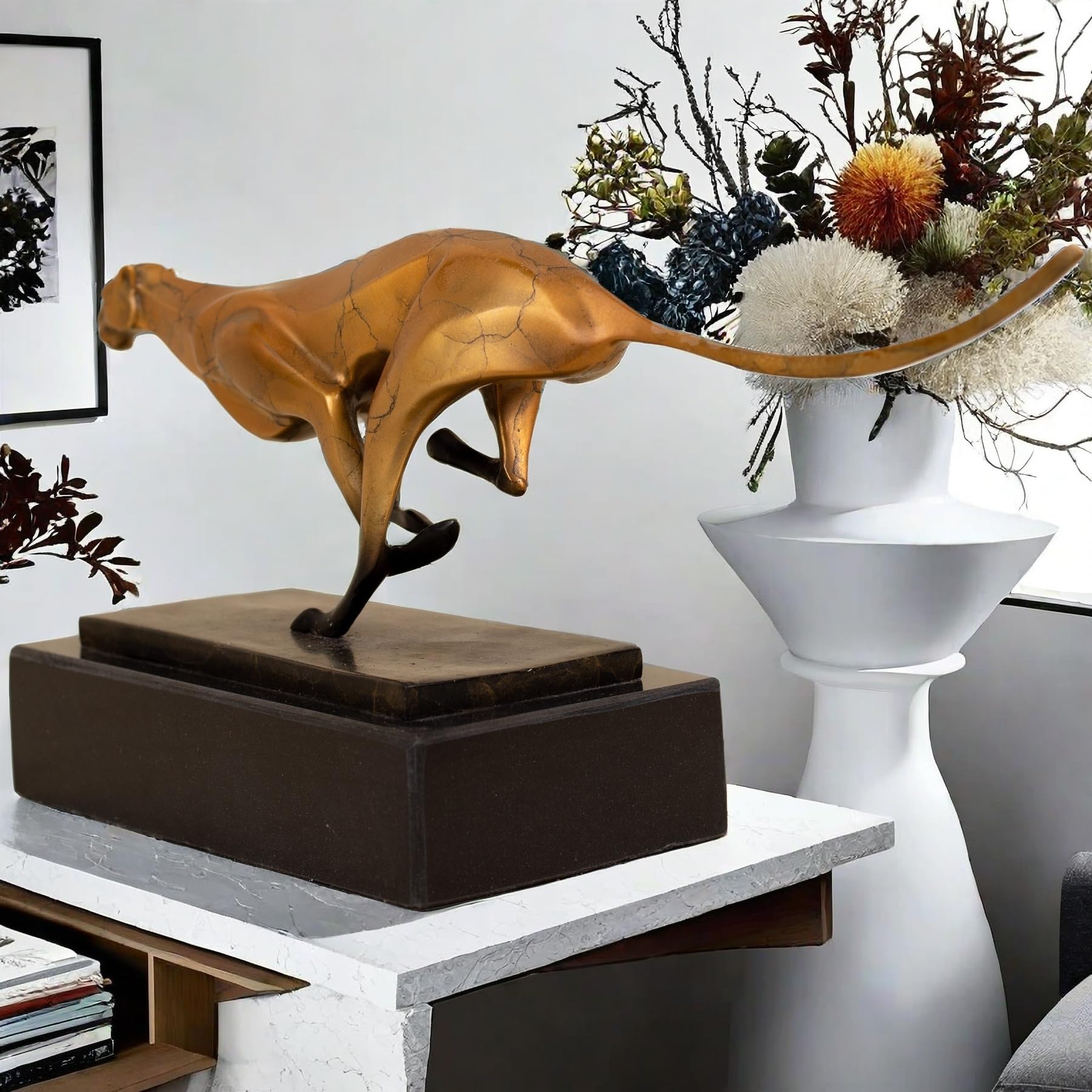- The cheetah is known for its speed and elegance, and this sculpture perfectly captures those qualities. The sleek lines and poised stance of the cheetah create a sense of motion and vitality, making it a captivating focal point in any room.