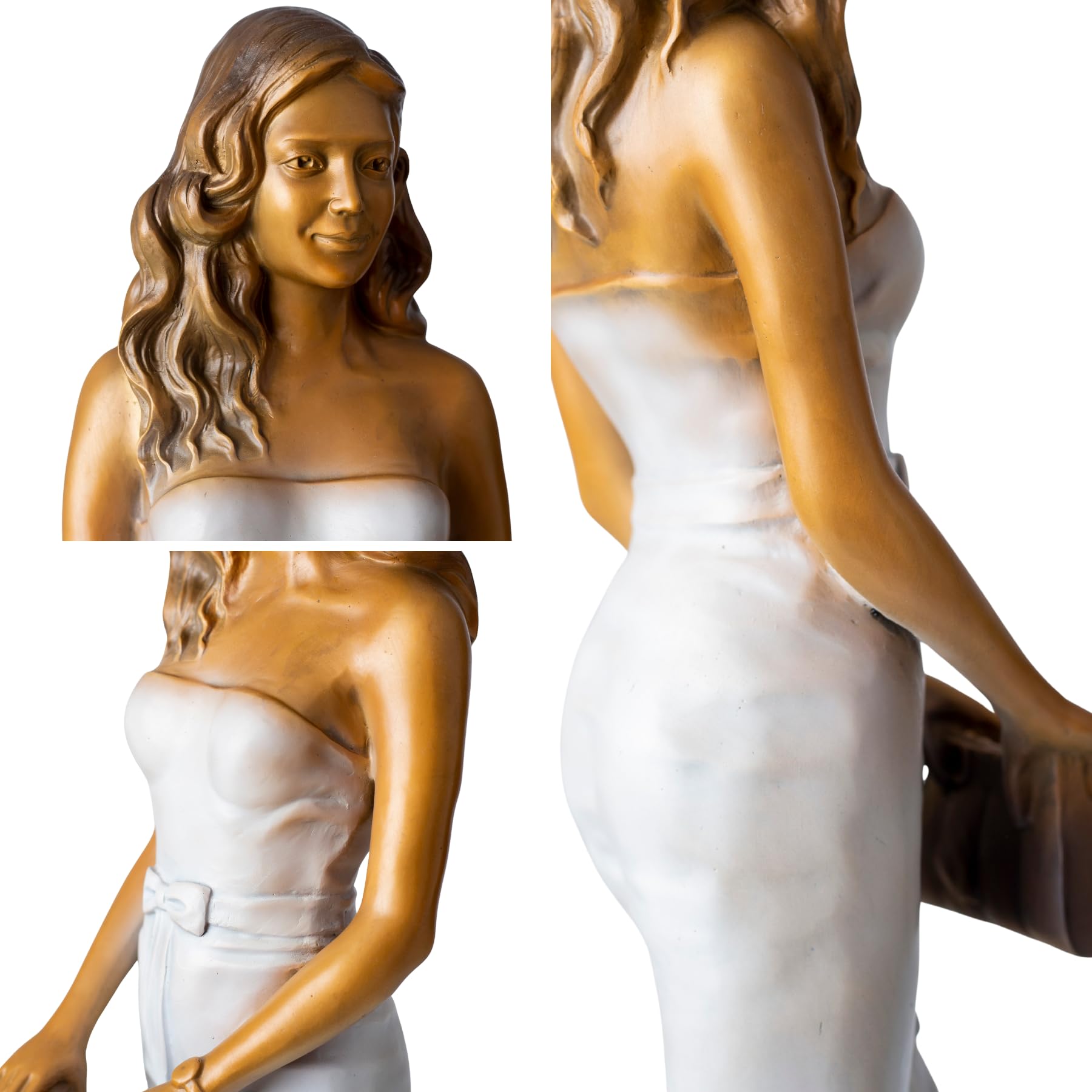 Crafted through the time-honored lost-wax casting technique, every curve and fold is brought to life in solid bronze, ensuring durability and heirloom quality. The sculpture stands 59 cm (23.2″) tall with a balanced 28 × 28 cm (11″ × 11″) footprint, offering a substantial presence without overwhelming your decor. Weighing approximately 6–7 kg (13–15 lbs), it feels reassuringly solid and stable, a hallmark of fine bronze artistry.