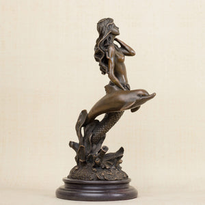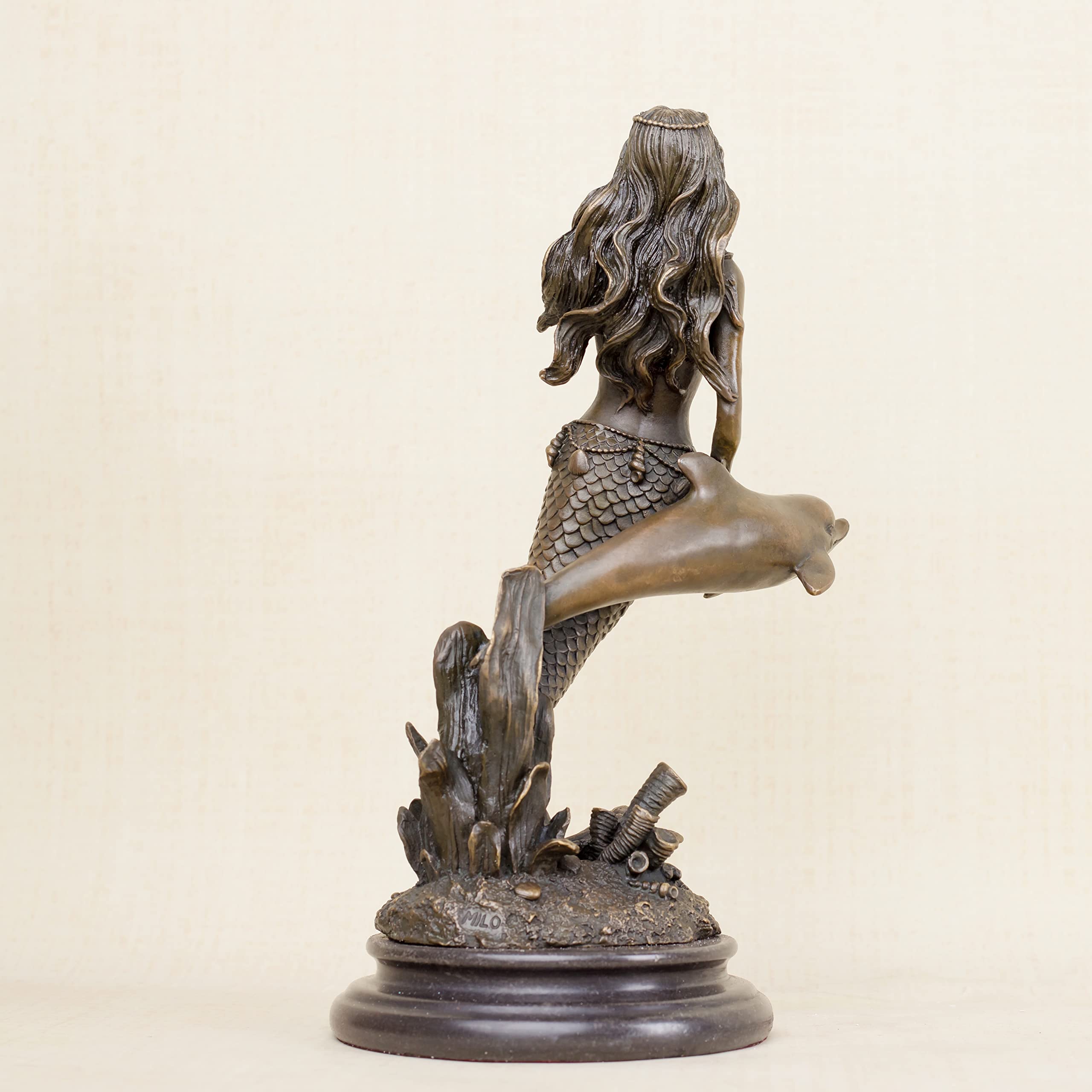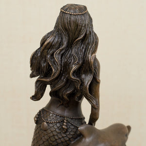 Mermaid and Dolphin Bronze Sculpture ā 13.7" Hand-Cast Fine Art Statue on Natural Marble Base, Modern Oceanic Decor & Premium Gift